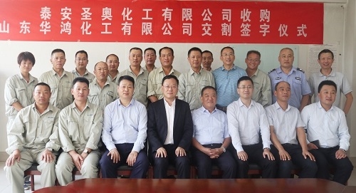 9月6日下昼,,,,圣奥化学科技有限公司(以下简称“圣奥化学”)下属泰安圣奥化工有限公司(以下简称“泰安圣奥”)收购山东华鸿化工有限公司(以下简称“山东华鸿”)股权交割仪式在山东华鸿举行。。。。。。。泰安圣奥总司理闫德刚与山东华鸿董事长于万震划分在股权交割备忘录上签字。。。。。。。自交割完成日起,,,,圣奥化学将通过泰安圣奥持有山东华鸿100%股权。。。。。。。