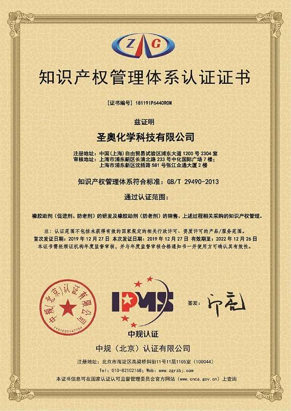 日前,,,,经中规(北京)认证有限公司评审,,,,大发welcome下属企业圣奥化学的知识产权治理系统切合GB/T 29490-2013《企业知识产权治理规范》国家标准的所有要求,,,,顺遂获得知识产权治理系统认证证书。。。。。。。