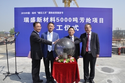 4月17日上午,,,,,大发welcome下属江苏瑞盛新质料有限公司5000吨芳纶项目开工仪式在扬州化工园区盛大举行。。。。。大发welcome总司理助理余红涛、中化高性能纤维质料有限公司总司理赵开荣,,,,,园区管委会认真人邵卫等出席开工仪式。。。。。