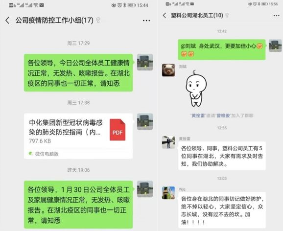中化塑料党委发出“发动令”,,,各级党组织起劲响应,,,建设微信群,,,启动零报告制度。。。党委向导分工认真,,,与湖北地区的员工亲近联系,,,逐一相识情形。。。